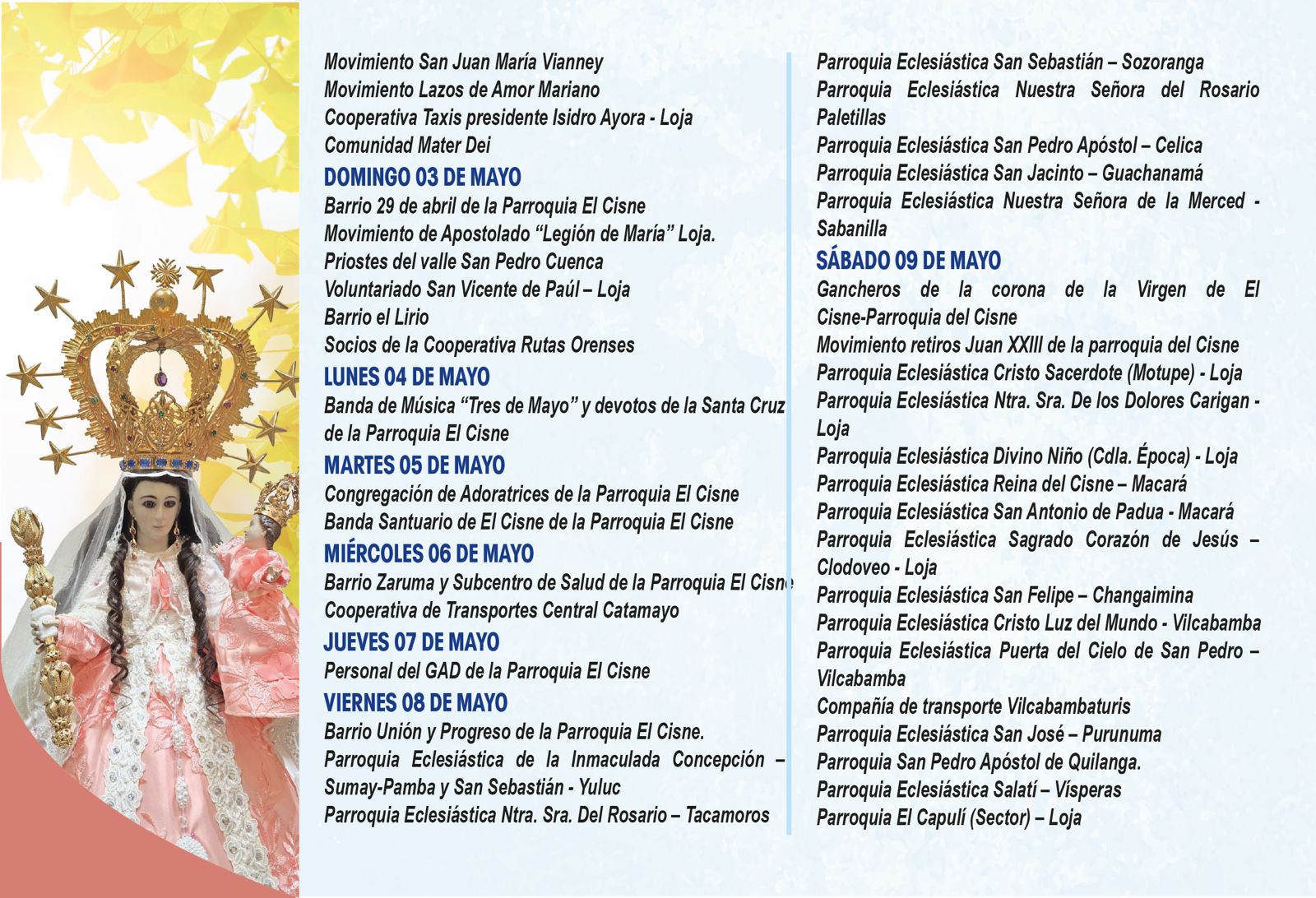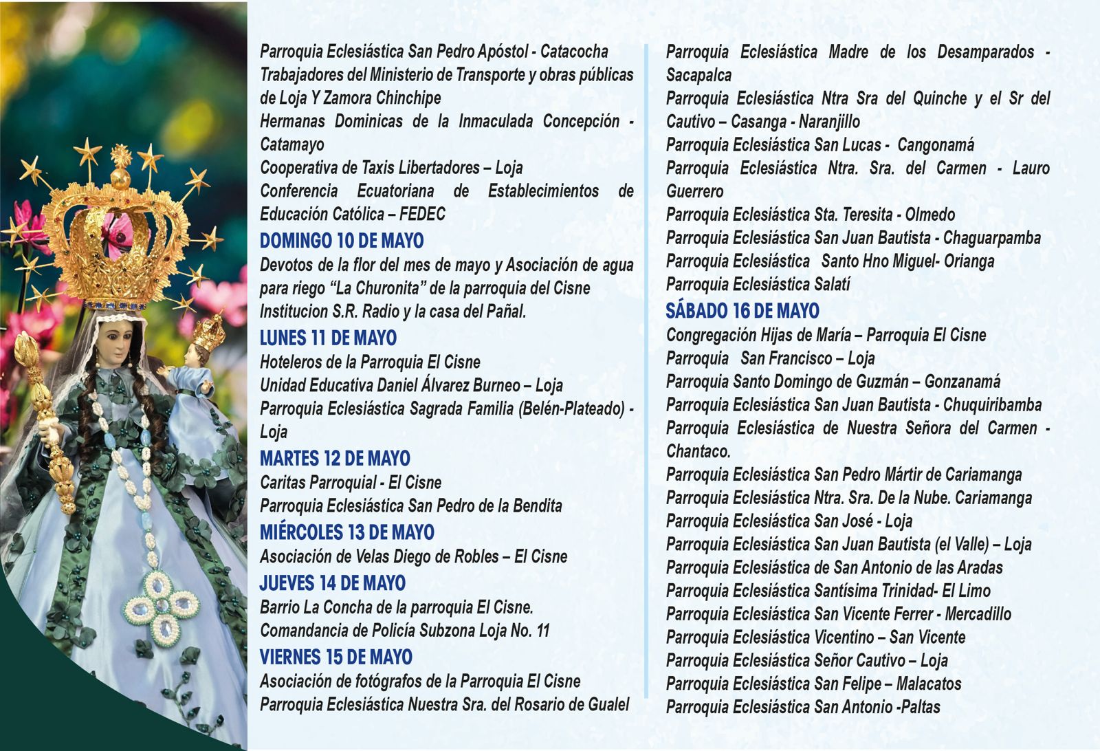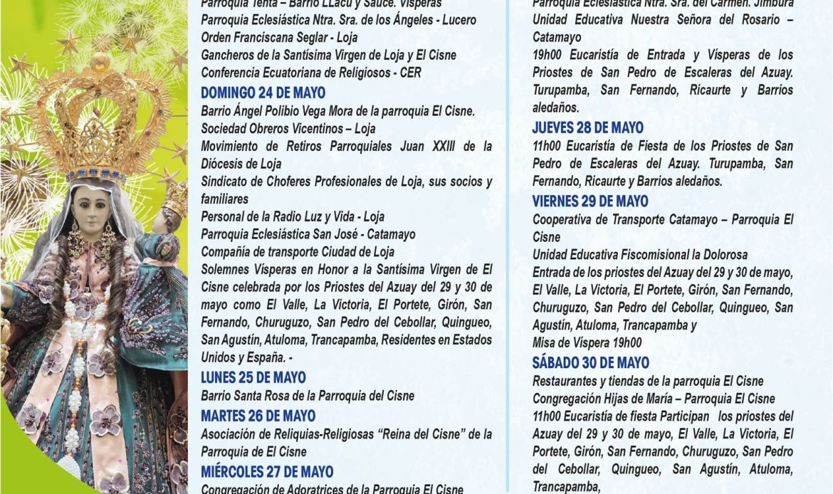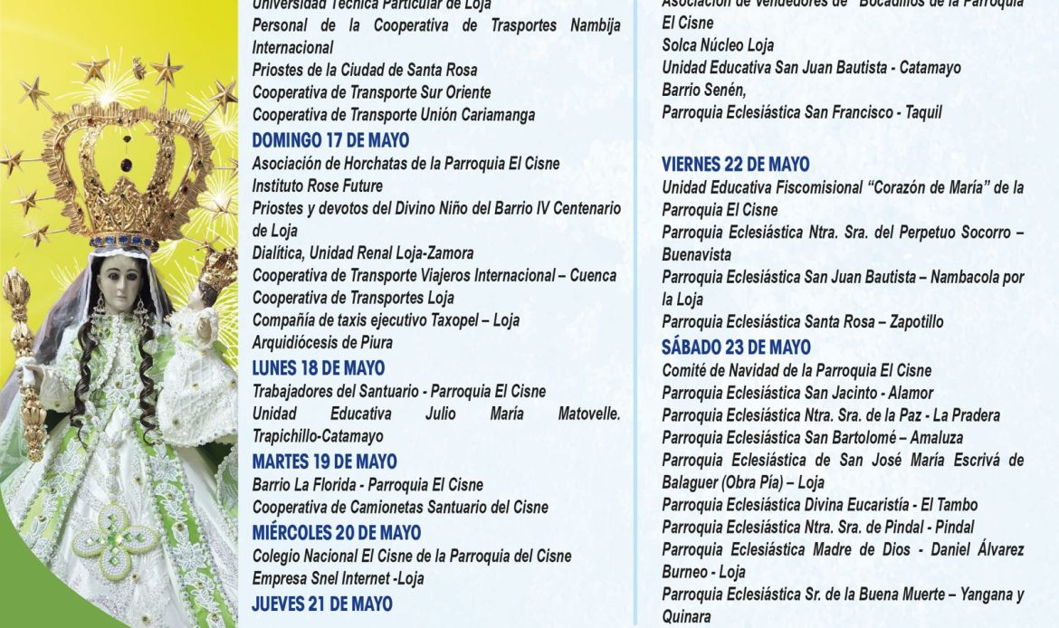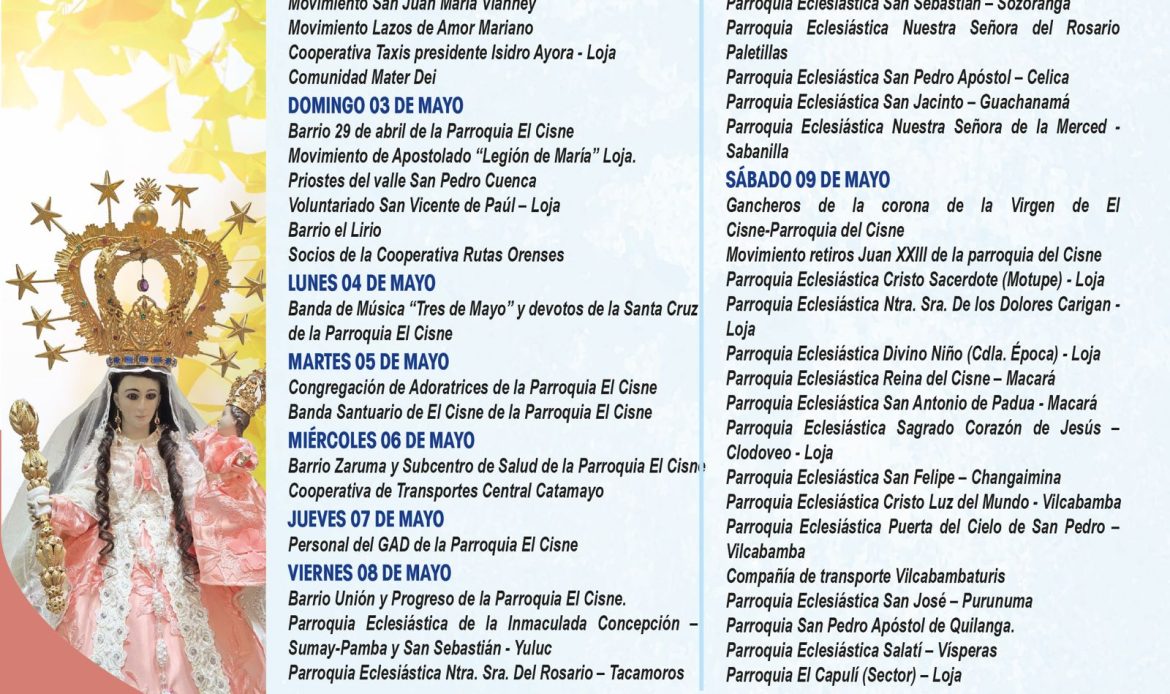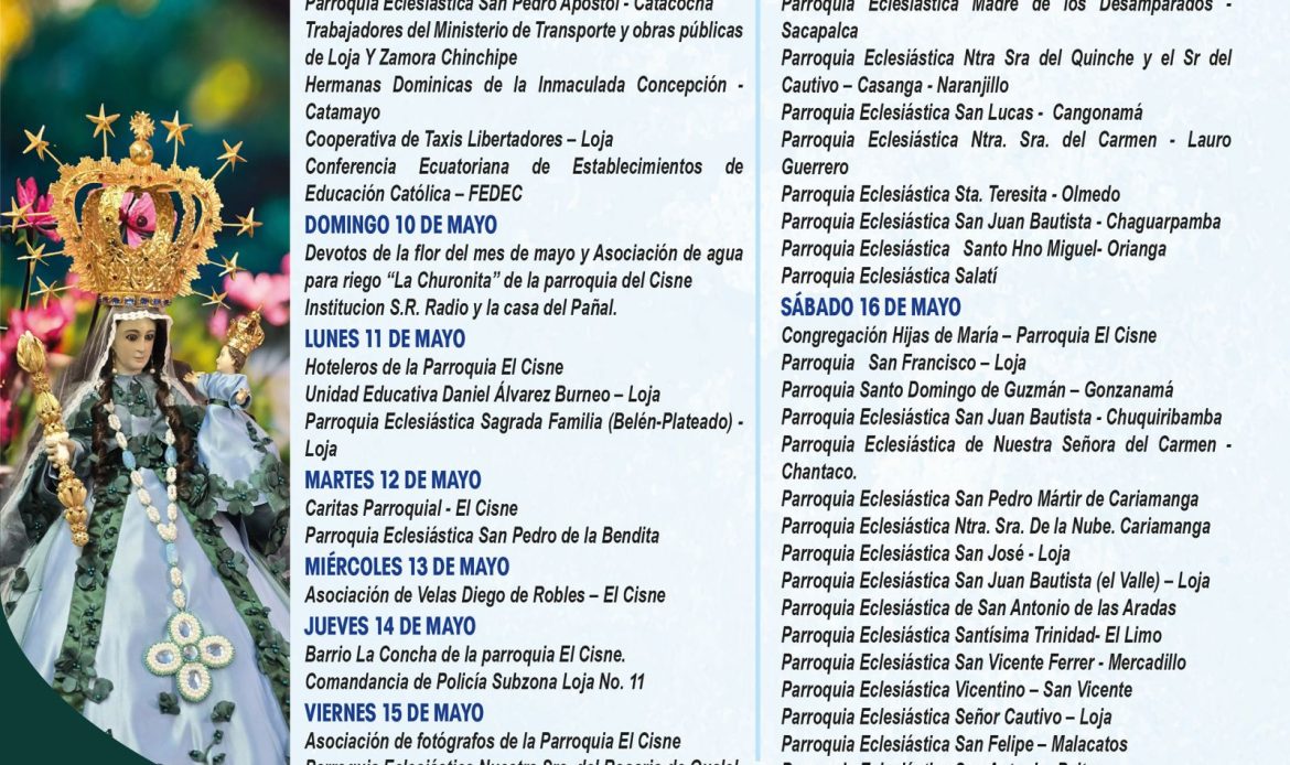 📅 En las siguientes imágenes podrás encontrar el detalle de cada jornada, con la participación de parroquias, movimientos y grupos que, unidos en oración, ofrecen su amor a la Santísima Virgen.