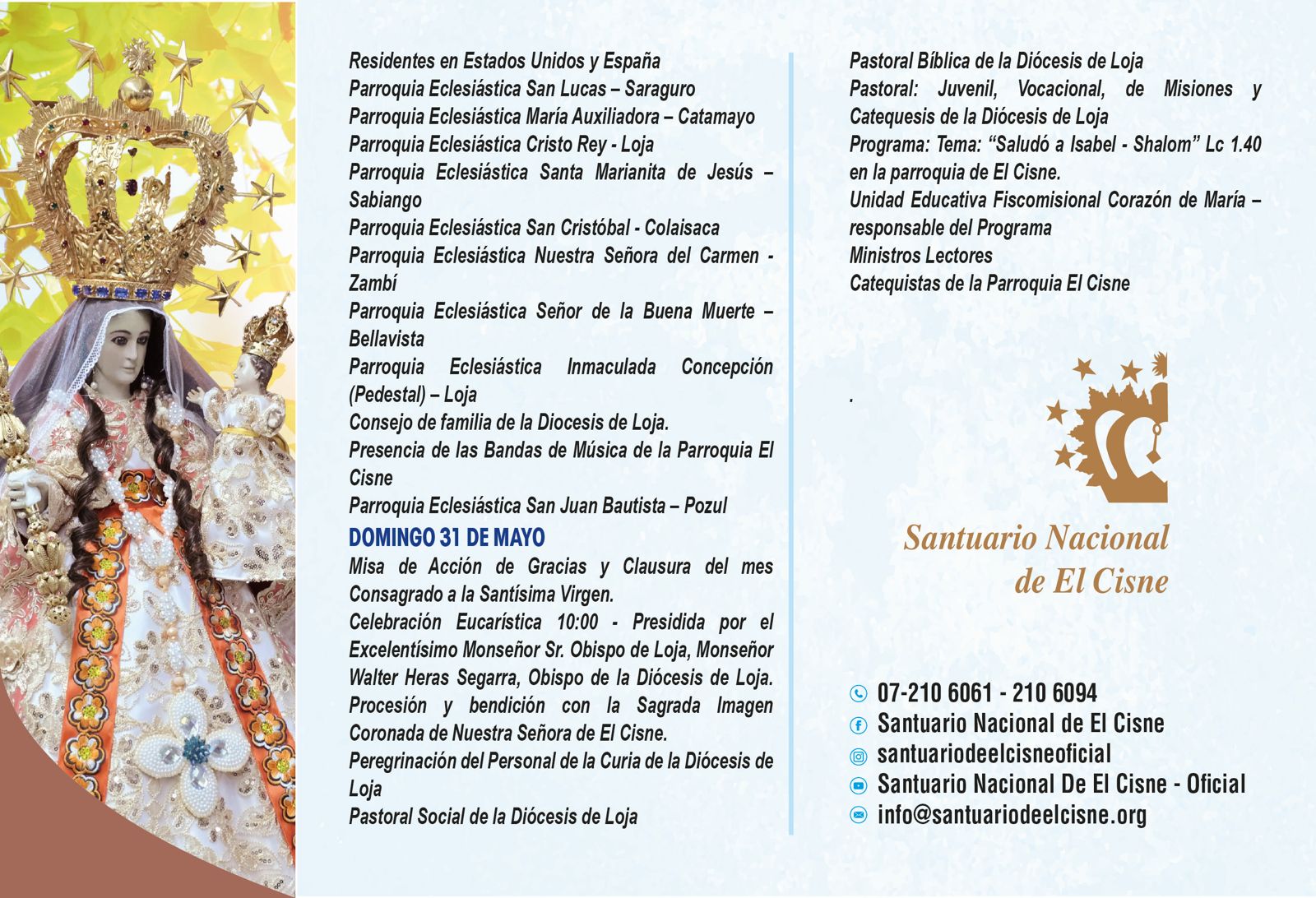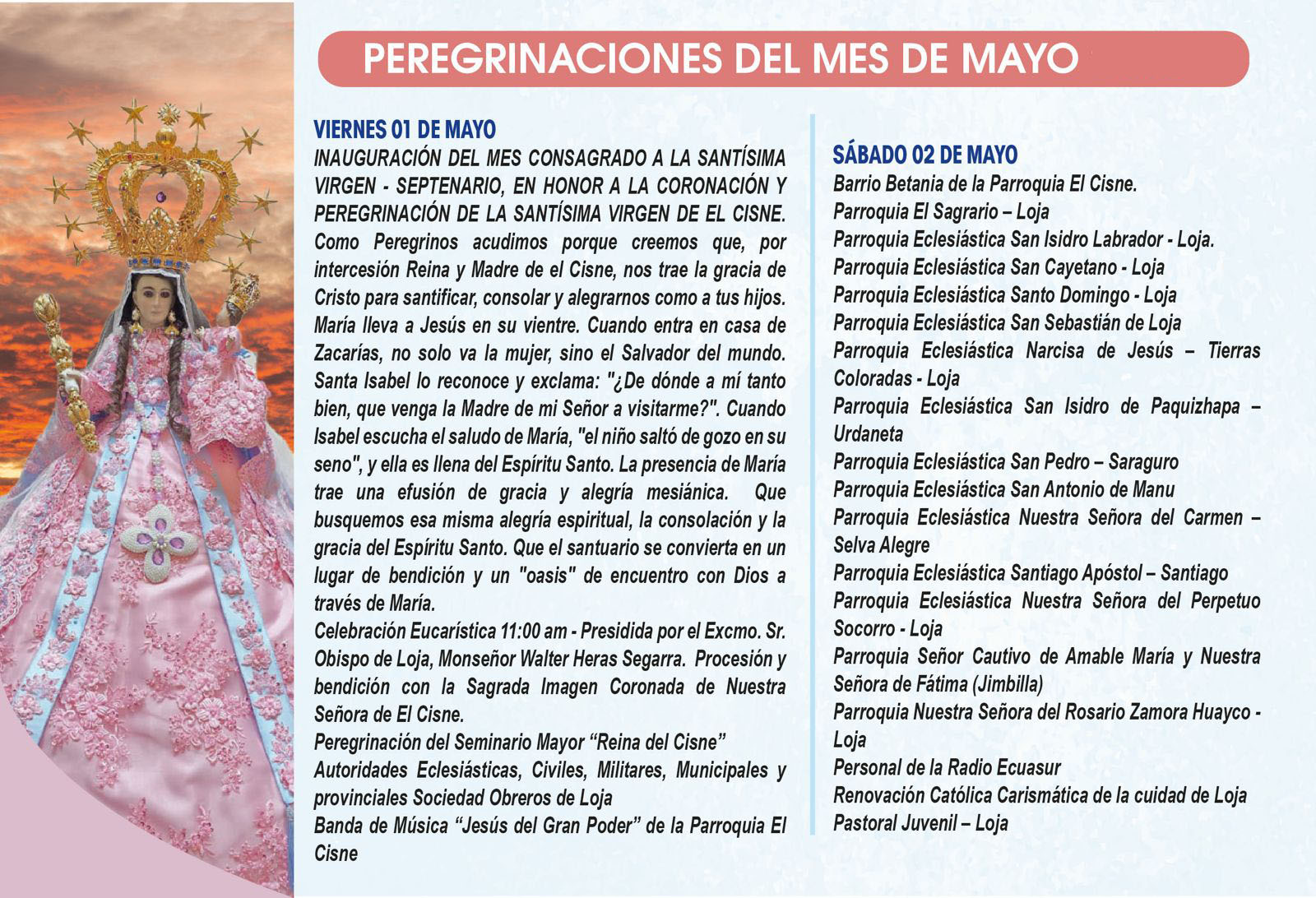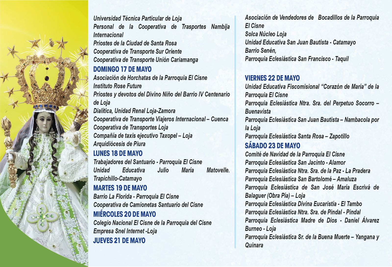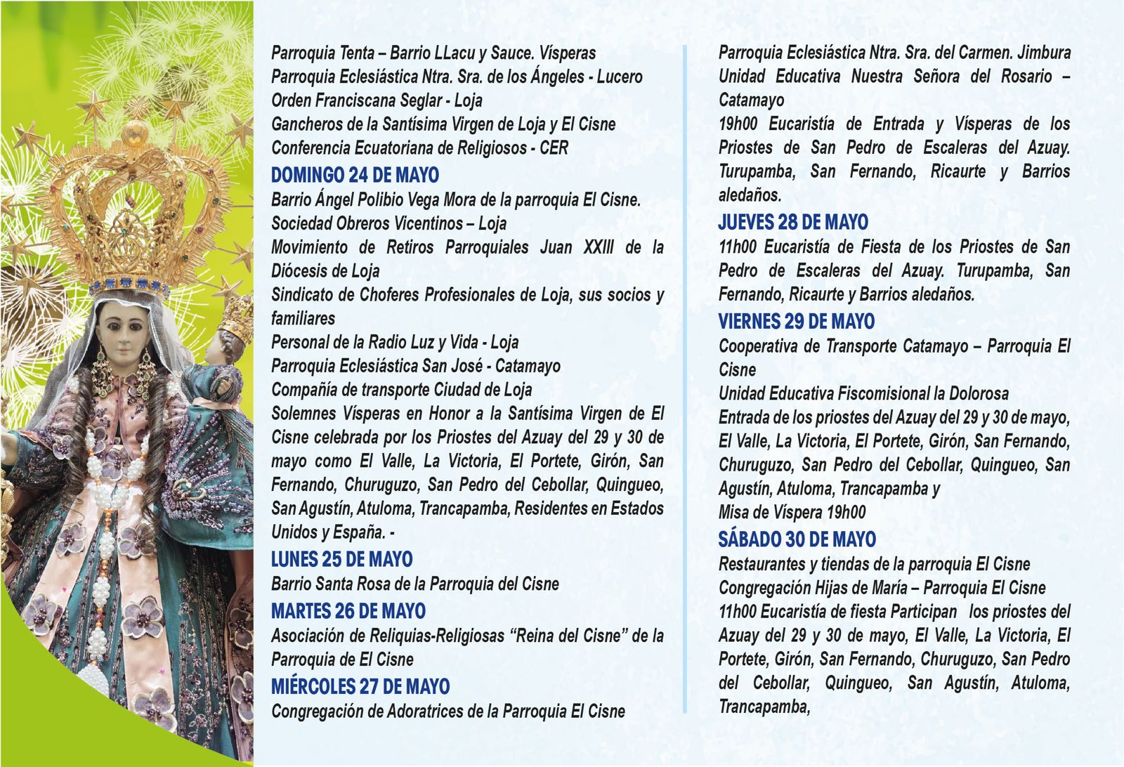 📅 En las siguientes imágenes podrás encontrar el detalle de cada jornada, con la participación de parroquias, movimientos y grupos que, unidos en oración, ofrecen su amor a la Santísima Virgen.